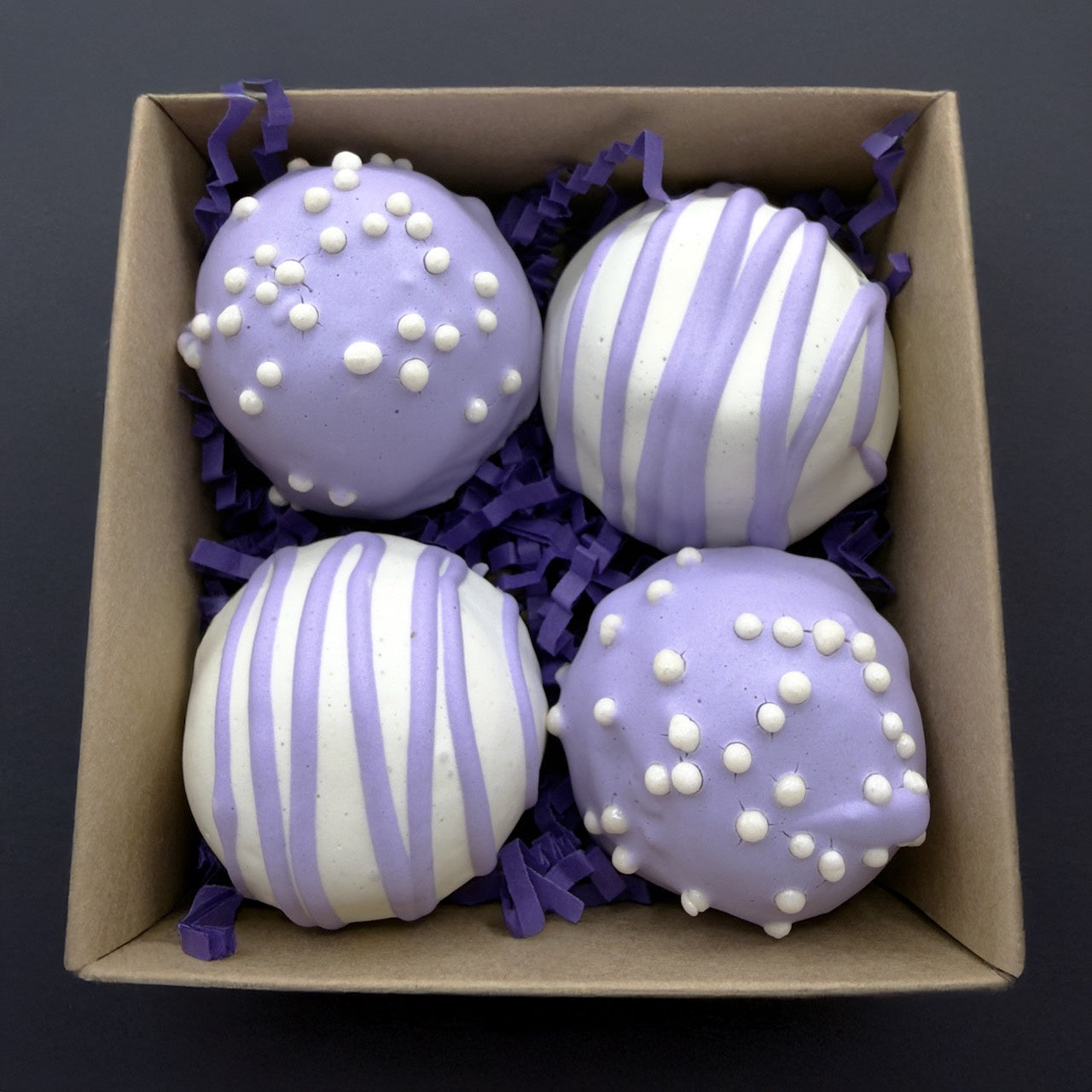 It is a box of four domed candies that are decorated with our icing. Colors will vary as will decorations depending on the batch. We'll always make them look great.
