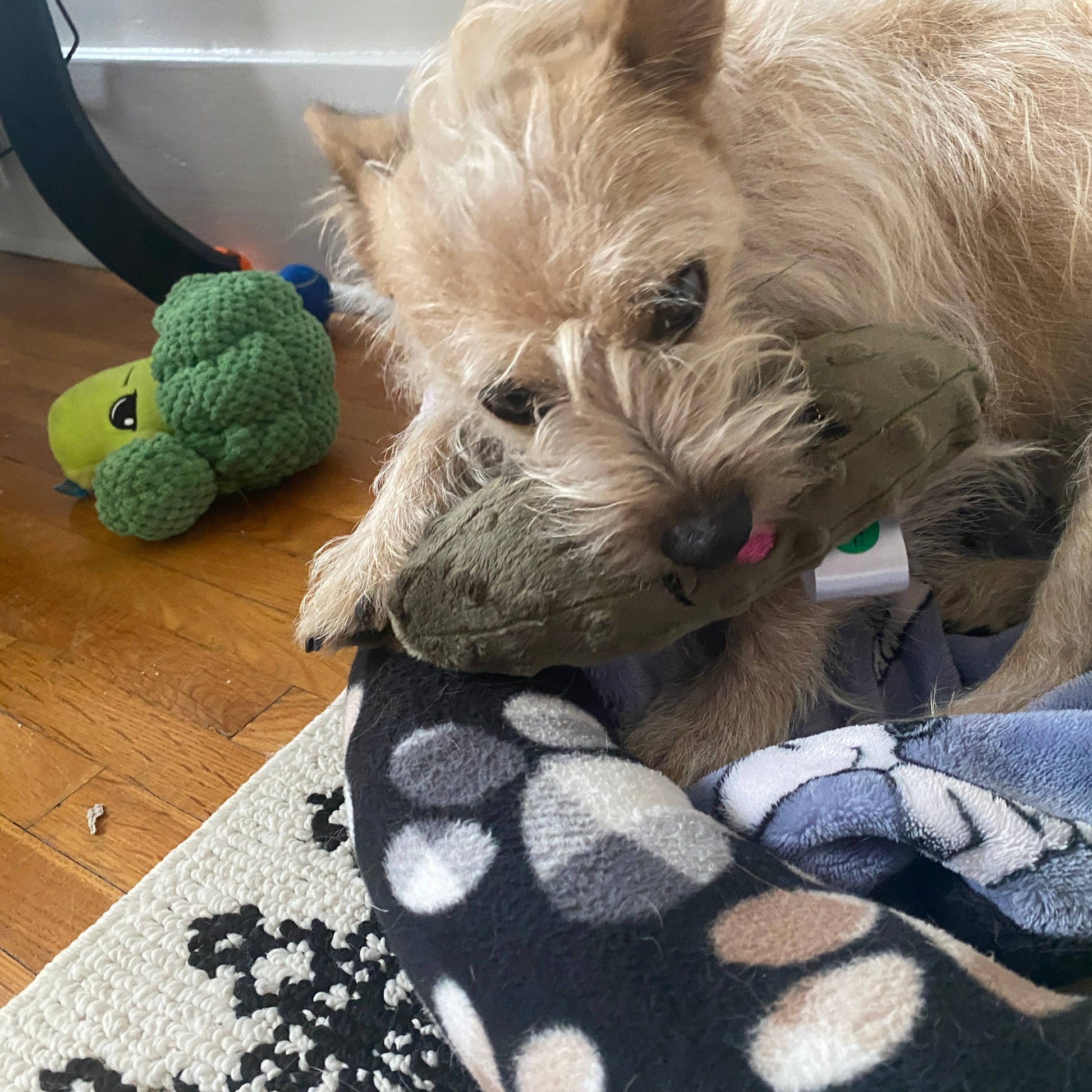 Handmade Dog Squeaker Stuffed Pickle plush toy that comes in the shape of a pickle. Ideal for tossing, or cuddling. Give your cute little furbaby a Screaming Pickle double-stuffed Pickle and watch them go crazy. This plush toy is filled with cotton/ploy filling and a squeaker that entices your pups to play. Ideal for tossing or cuddling, this Screaming Pickle Squeaker keeps your pups occupied for hours to come. Size 9" H x 2" W x 2" D