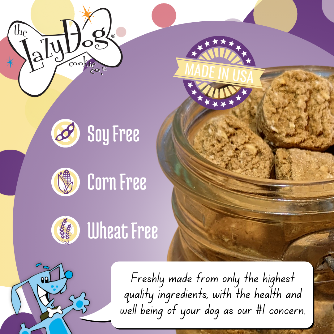 For the most discriminating palettes, this soft-baked cookie boasts savory bacon, sweetened with a hint of maple. Woody honey and roasted vanilla balance out this hearty, rolled oats delight. 100% Natural Treats for Dogs Wheat-Corn-Soy Free! * High in Antioxidants * Limited Ingredients * Naturally Nutritious Ingredients: Rolled Oats, Honey, Oat Flour, Vegetable Glycerin, Rice Flour, Whey, Coconut Glycerin, Vanilla, Maple, Natural Pork & Natural Smoke Flavor. Guaranteed Analysis: Crude Protein Min. 7.61% Crude Fat Min. 15.28% Crude Fiber Max. .83% Moisture Max. 12.08% 12 Calories per .132oz. (approx. 1 treat) Calorie Content 3482 Kcal/kg Net wt. 5.0oz